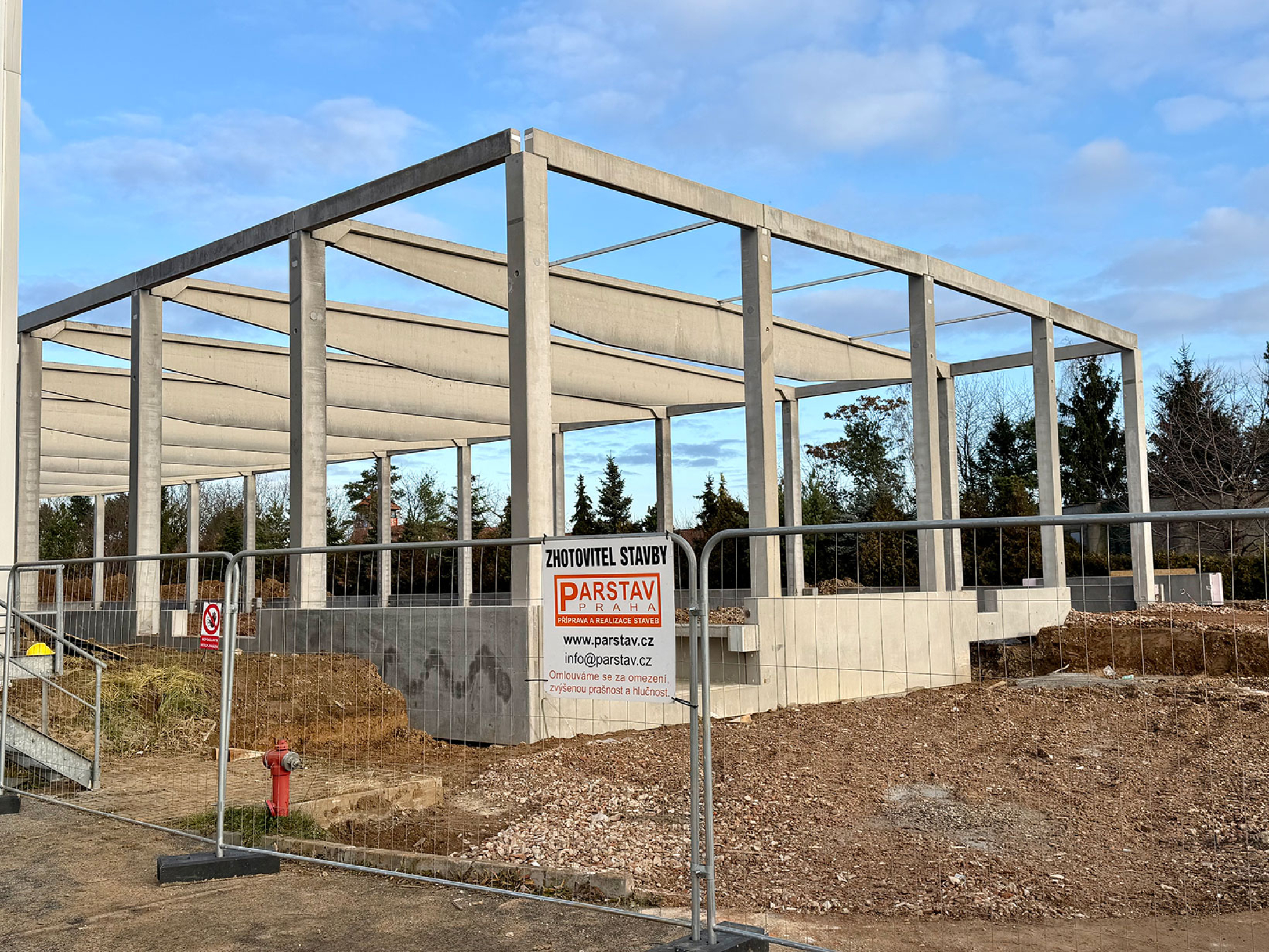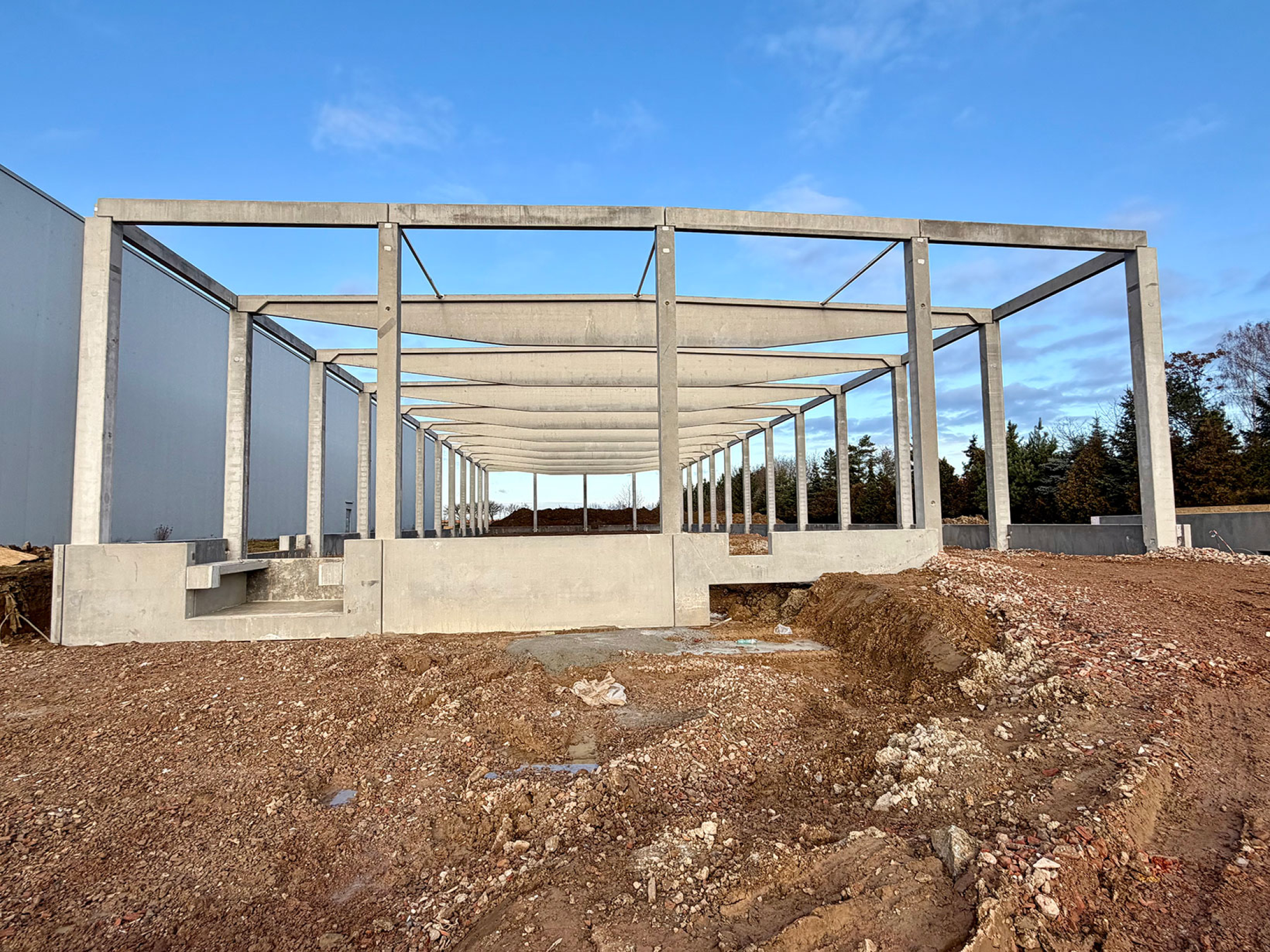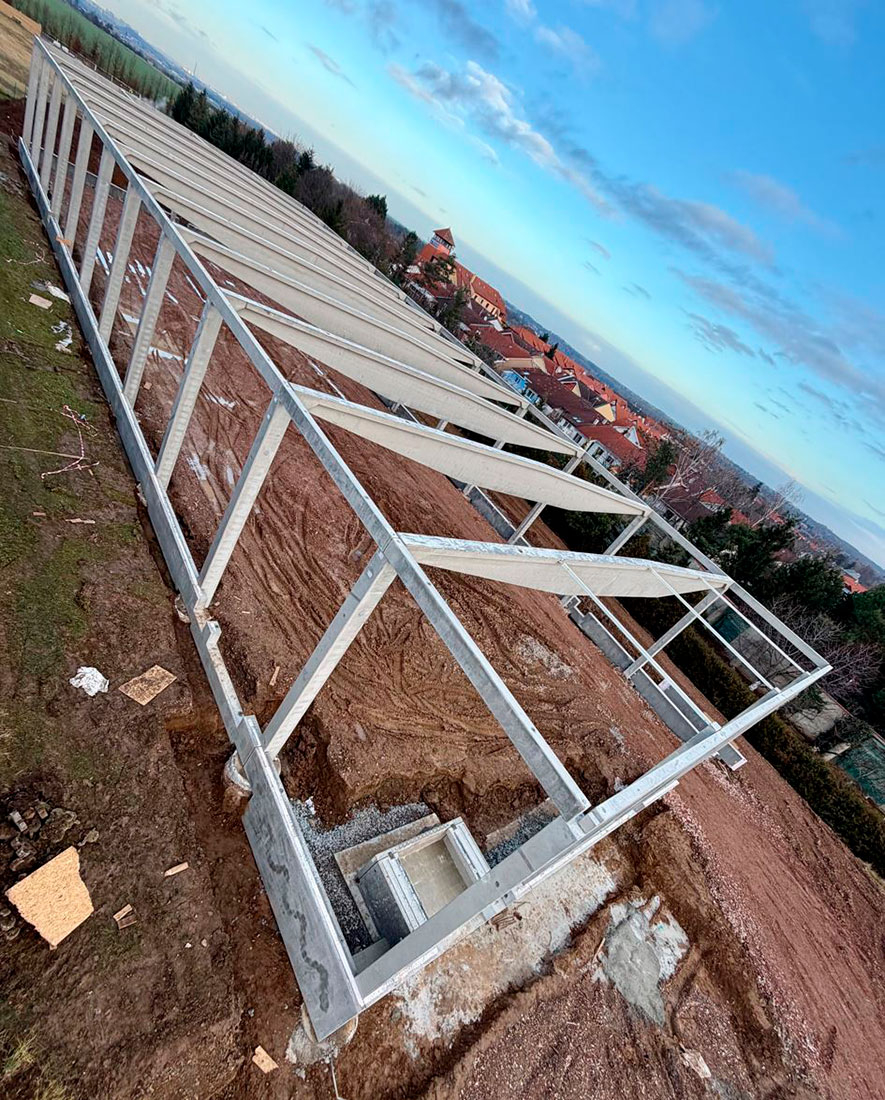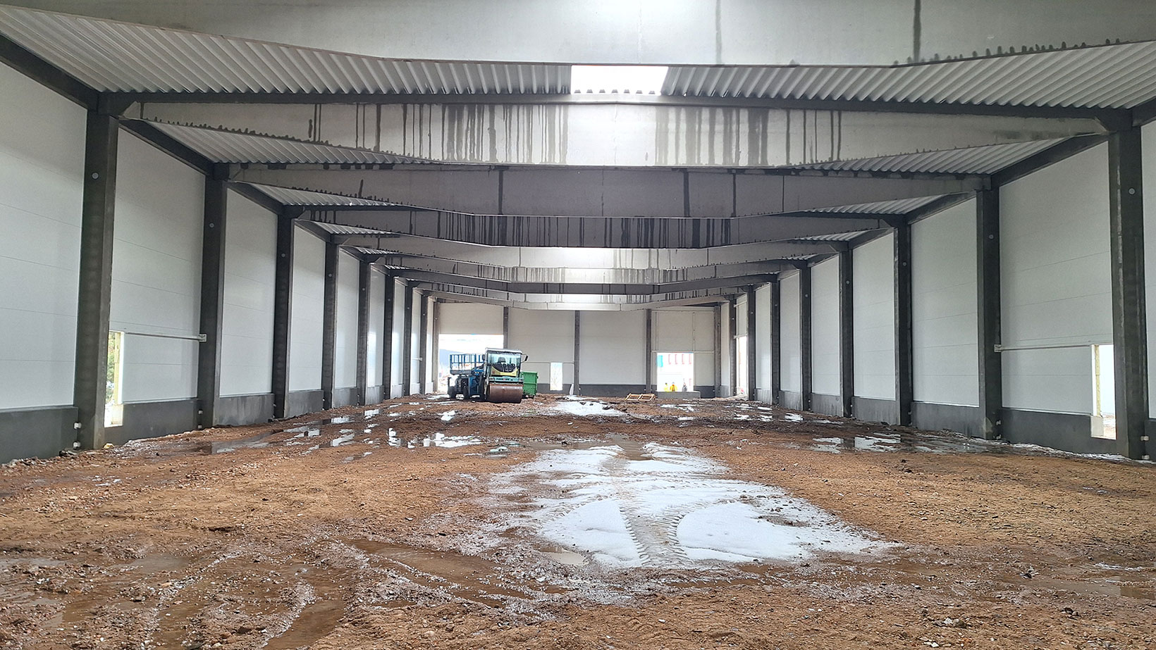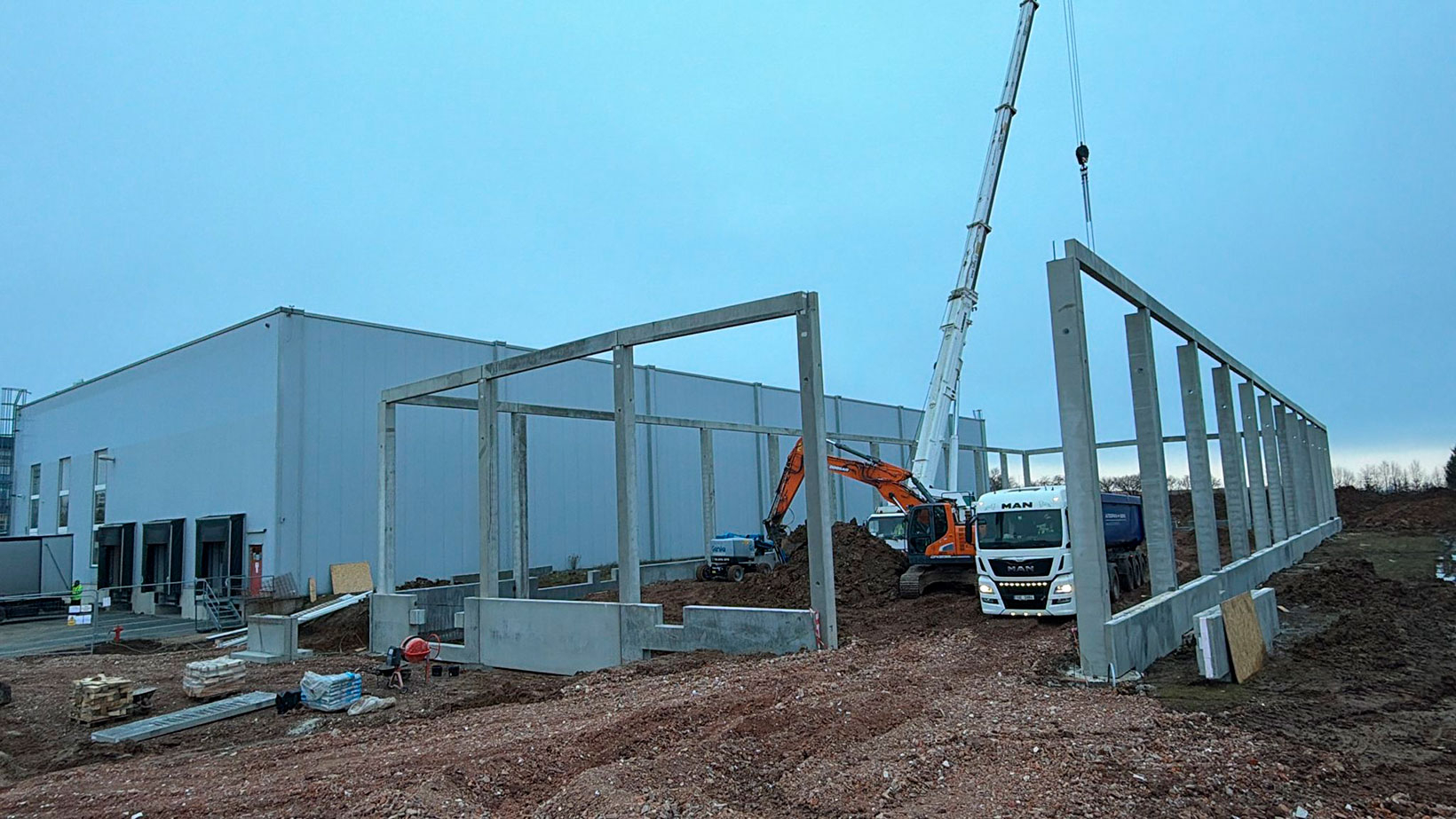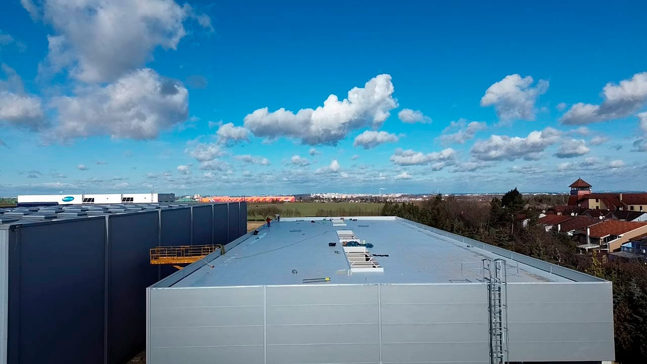 Stavba nové montované skladovací haly v Nupakách u Prahy, připravenou pro efektivní skladování materiálu klienta.